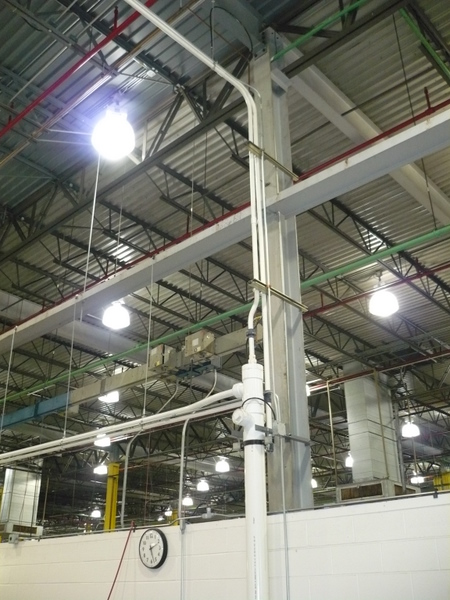 ![]() This panel turns pumps off and on according to a cycle that is set up on a 24 hour timer. A PLC controls the start, stop sequences and a backflush cycle. It also monitors several fault conditions and shuts down pumps to prevent spills. A single indicator light flashes in a coded sequence to tell which condition caused the fault. An inverter type speed controller in the upper right corner drives a 3 hp. pump that supplies coolant to the machines. Constant pressure is maintained by programming the inverter to follow a pressure switch. The small submersible return pumps are switched by solid state relays mounted on the door. They are also protected by GFCI receptacles. |